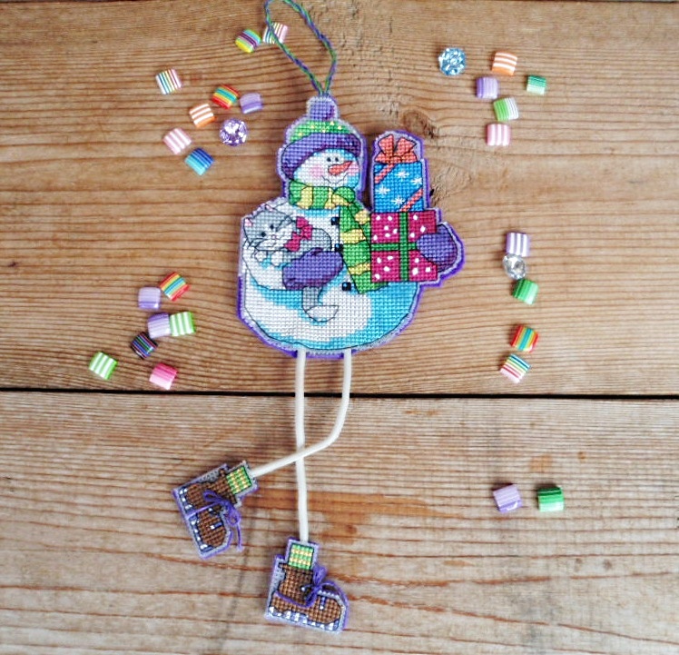 вышитый крестиком на пластиковой канве снеговик - игрушка на елку